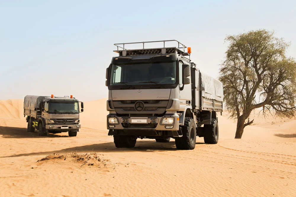 As a pioneer in the region, Mercedes-Benz understands the complex and demanding requirements of the Oil & Gas industry and offers suitable transport solutions to fully support your business: To transport pipes, chemicals, drilling equipment, staff, fuel, water, and other materials to and from explorations and drilling sites, many of them in most difficult terrains and most remote locations. Each of our vehicles is developed, built and tested with daily use in mind. Only a truck which can fulfil the demands of practical operation can meet our expectations – and yours, too.