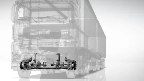 A wide choice of rear axle ratios matched to various operating profiles also plays a role in keeping fuel consumption low. Economical auxiliary consumers, such as the on-demand power steering pump and new air-conditioning unit also contribute to low fuel consumption. The further advanced hypoid twin axles contribute to low fuel consumption on the Actros.