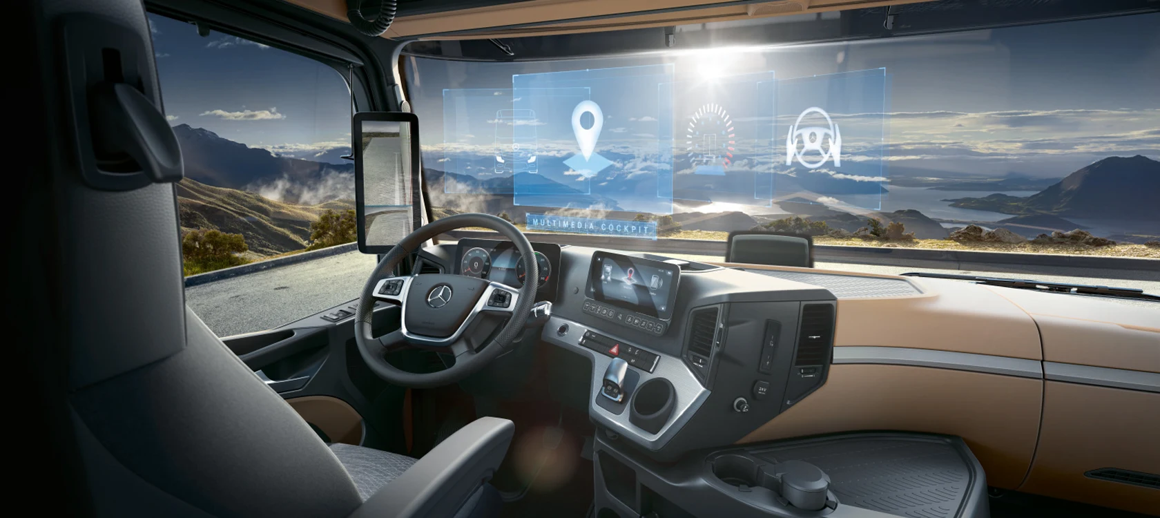 The Actros features the innovative Multimedia Cockpit for enhanced driving comfort, ergonomics and ease of operation. The primary colour display and the secondary touch display, can be operated via the new multifunction steering wheel with Touch Control buttons.