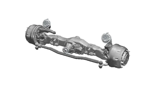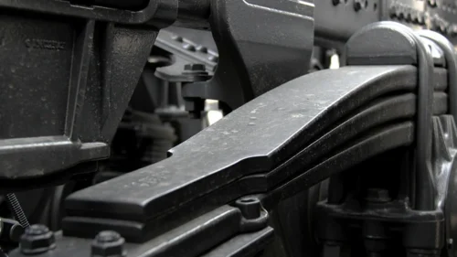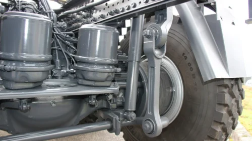 The Zetros can be equipped with 3- or 4-leaf parabolic springs for the front axle. The 3-leaf parabolic springs for the front axle are designed for a load capacity of 7.5 t. The individual spring leaves are not located directly on top of each other, but are installed with a slight gap for corrosion protection. The same construction is used in the 4-leaf parabolic springs for the front axle, designed for loads up to 9.0 t. Specially tuned shock absorbers are used for both parabolic spring versions.