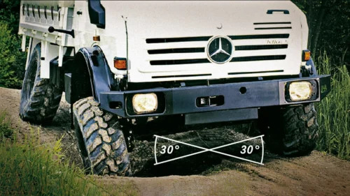 Thanks to its long-travel coil springs (instead of the typical leaf springs used by trucks), the Unimog U 4000/U 5000 has a short frame overhang at front and rear, enabling it to tackle even steep ramps and embankments with ease. Its low centre of gravity and extreme torsional flexibility provide additional security with respect to steep slopes and tipping angles.