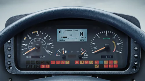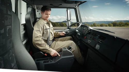 The driver information system (FIS) allows all important functions to be checked at a glance – including status reports, event reportsand menu-driven online diagnosis. The standard cruise control, speed limiter, electronic manual throttle control and the two-stage engine brake are all controlled with the multifunction lever on the right-hand side of the steering column. Optical and acoustic signals help the driver to respond immediately if the need arises. The radio/CD player, optionally available with a Bluetooth interface and hands-free system, further enhances operating safety.
